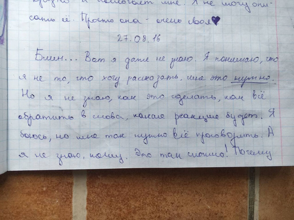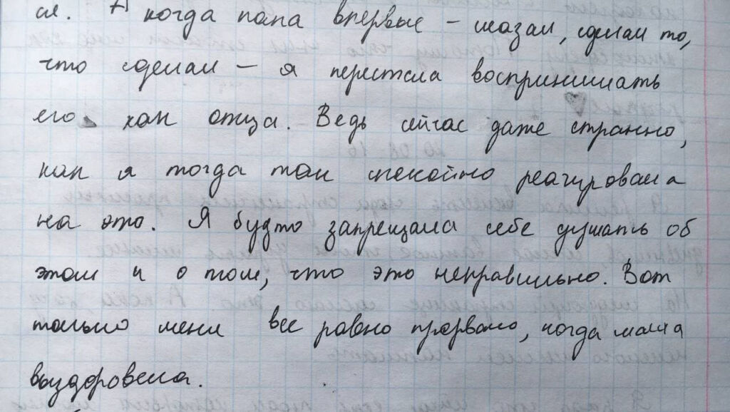 У меня в голове не было мысли о том, что происходит что-то ненормальное. Мама болеет раком — это грустно и тяжело. Папа пьет — это тоже грустно и тяжело. Но что меня дома кто-то домогается, насилует — такого у меня в голове не было. Не было для этого слов, я не понимала, что происходит. Я могла притащить его пьяного домой и тут же ответить кому-нибудь в чате, что у меня все хорошо.