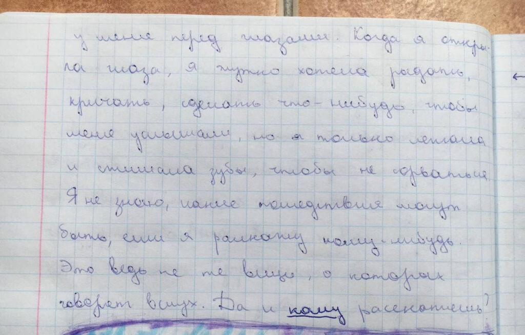 Я очень хотела кому-нибудь рассказать о том, что со мной происходило, и начала проговаривать эту историю в своей голове. Я составила фразы, заучила их, чтобы все рассказать. Каждую ночь я засыпала с мыслью о том, как буду это делать, а потом просыпалась и не понимала, кому я могу рассказать.