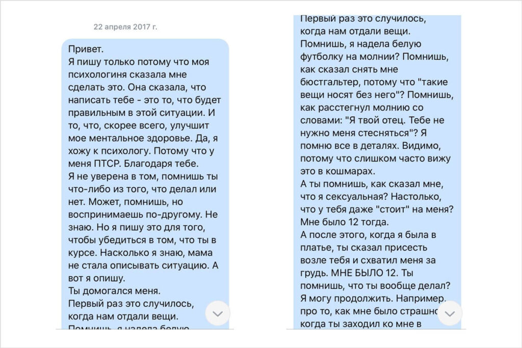 Я с ним связывалась после всего произошедшего один раз, по совету психологини. Я написала огромное сообщение: «Наверное, ты этого не помнишь, но ты меня насиловал. Теперь у меня шрамы, ПТСР, кошмары, я не могу жить нормальной жизнью и никогда не буду. Я очень злюсь, что ты живешь, а я не могу жить. Я тебя ненавижу». И отправила ему.