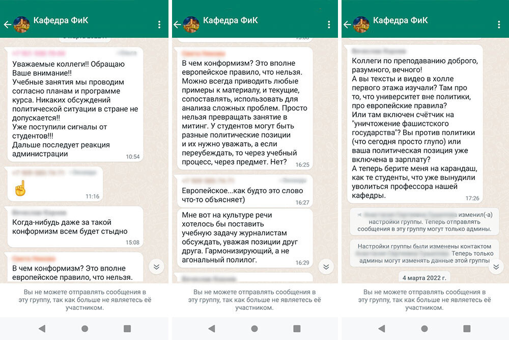 Вечером того же дня в кафедральном чате [чате сотрудников кафедры философии и культурологии. — Прим. «Гласной»] появилось сообщение от лаборантки: «Уважаемые коллеги!! <…> Никаких обсуждений политической ситуации в стране не допускается!! Уже поступили сигналы от студентов!!! Дальше последует реакция администрации». [Скриншот переписки есть в редакции, орфография и пунктуация автора сообщения сохранены]. Профессор, с которым я общалась утром, в ответ спросил, точно ли университет вне политики, все ли коллеги изучили тексты и видео в холле первого этажа, и попросил, чтобы его, как и меня, тоже взяли «на карандаш». После этого в чате всех заблокировали: право голоса оставили только у завкафедрой и лаборантки. Мой коллега Вячеслав Корнев подал заявление об увольнении через три дня после меня.