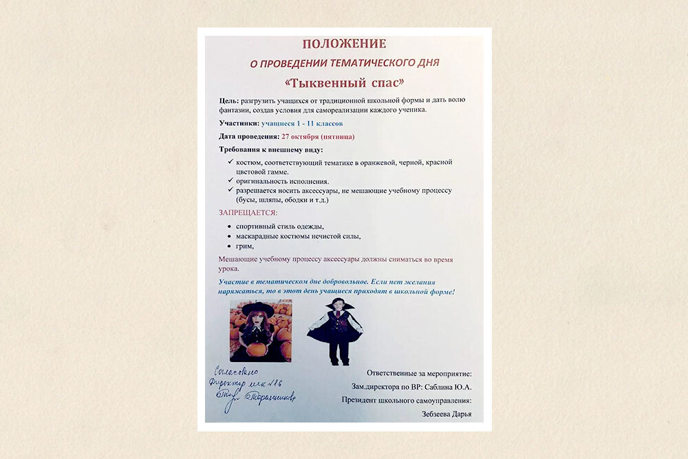 В школе № 16 города Ижевска, где решили проводить Тыквенный Спас, школьников заставили прийти 27 октября в парадной школьной форме, хотя изначально предлагали наряжаться в костюмы в оранжевой, черной и красной гамме. При этом администрация запретила «костюмы нечистой силы и грим». Как рассказала мне мама одного из школьников: «Дочь огорчилась, потому что приготовила костюм Спока из “Звездного пути”. Но им не разрешили одеваться в персонажей западной культуры. И знаете, кто сделал их праздник? Маленький мальчик из началки в маске Райана Гослинга. В Tik-Tok тысячи просмотров. Они называют его школьным героем и говорят: «Он не захотел быть, как общество, он просто выбрал быть счастливым»».