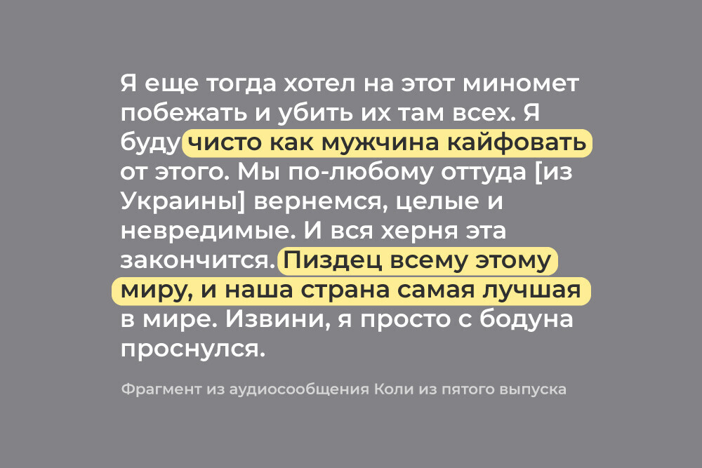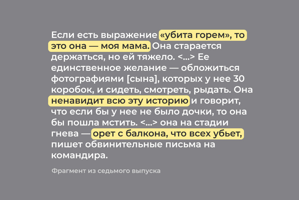 Оля: Мы делали [эпизод] очень медленно, и в какой-то момент мне пишет героиня: «Подкаста не будет: он убил мою бабушку». Это был полный звездец. Мы приняли волевое решение на нее не давить и подождать, дать ей время. Я долго с ней разговаривала, она все это переваривала и в итоге передумала: вдруг кто-то послушает [подкаст] и не пойдет воевать. То есть мы просто дождались. Когда мы делали эпизод, еще не было никаких смертей. Но мы понимали, что такие истории просто не могут окончиться нормально. Обязательно случится что-то нехорошее.