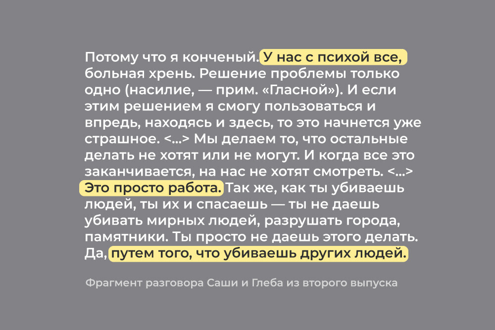 Мне кажется, это очень интересное живое свидетельство о войне. Простая девушка, выступающая за ценность каждой человеческой жизни, сталкивается с вагнеровцем, вернувшимся с войны. При этом он — ее брат. По тому, как Саша разговаривала с ним, заметно, что она пыталась понять его мотивацию. Но пока я слушала его поток сознания, мне было плохо, прям на физическом уровне, меня тошнило. Слушателей мы поберегли и привели в порядок этот поток — в эпизоде они слышат сокращенную версию.