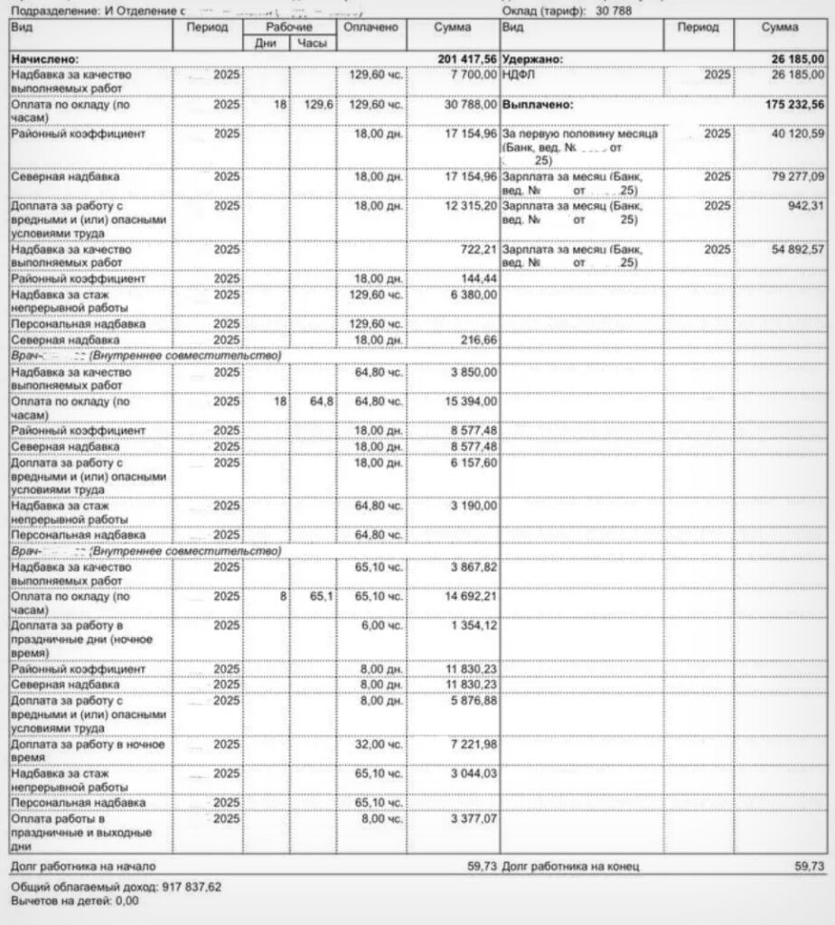 Зарплатная выписка Елизаветы (некоторые данные скрыты для сохранения анонимности)